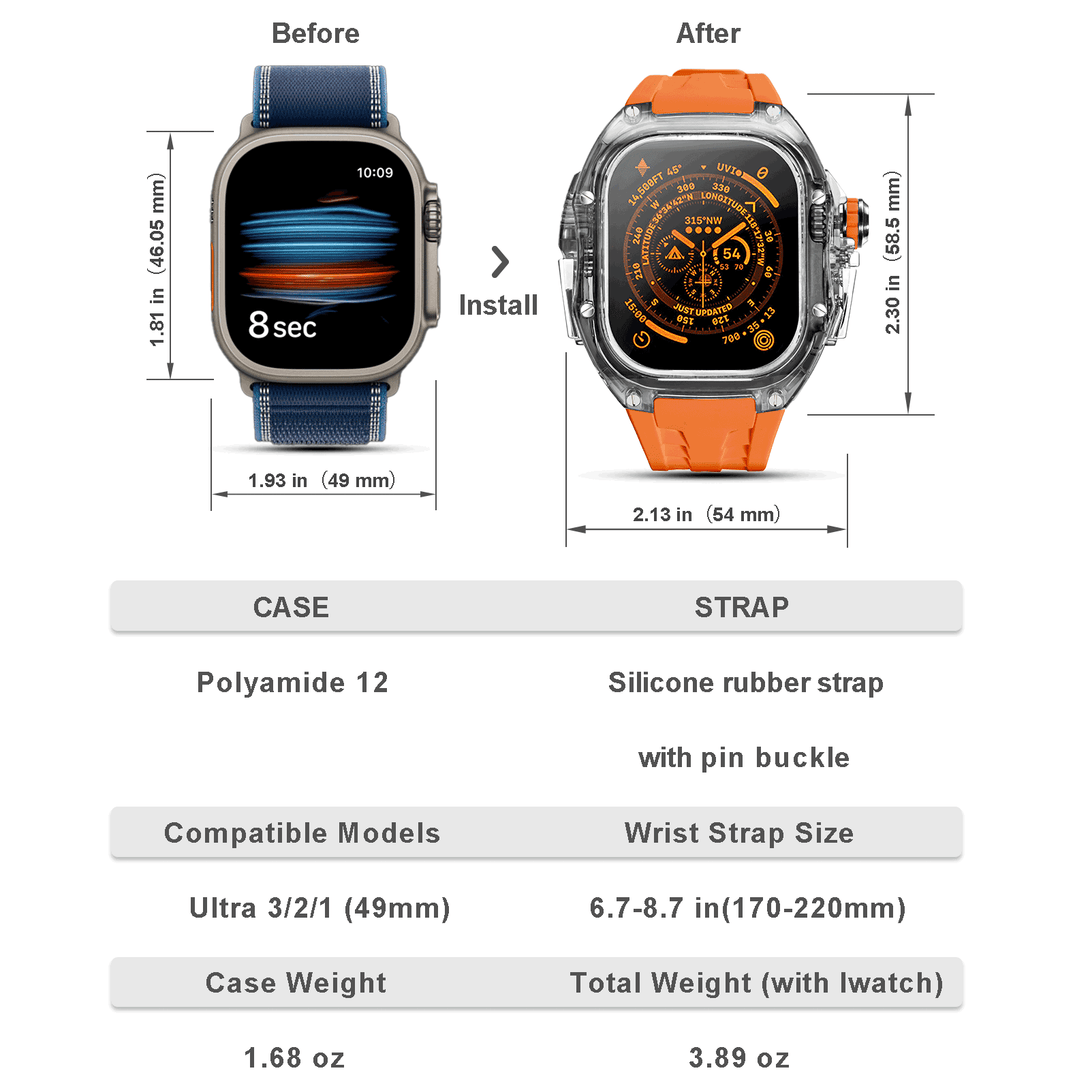 Apple Watch 49 mm: 1.93 in x 2.28 in x 0.55 in